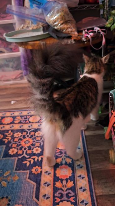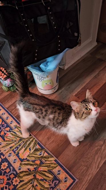She’s friendly, affectionate, and loves to “chat” with her people. With her gorgeous long fur and adorably large paws, she’s as stunning as she is sweet. She’s a domestic beauty who gets along well with other cats and dogs, too (with proper introduction, of course).